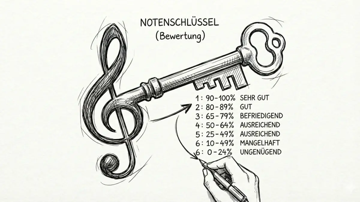 Der Notenschlüssel-Generator auf notengebung.de bietet vier Standardschlüssel an – vom milden bis zum strengen Maßstab – und lässt sich vollständig individuell anpassen. Das Ziel ist nicht, einen Einheitsschlüssel vorzuschreiben. Das Ziel ist, die Entscheidung sichtbar zu machen. Wer weiß, welchen Schlüssel er verwendet, kann ihn erklären. Wer ihn erklären kann, hat darüber nachgedacht.