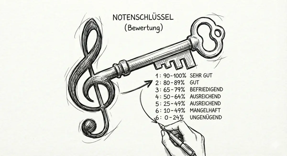 Der Notenschlüssel-Generator auf notengebung.de bietet vier Standardschlüssel an – vom milden bis zum strengen Maßstab – und lässt sich vollständig individuell anpassen. Das Ziel ist nicht, einen Einheitsschlüssel vorzuschreiben. Das Ziel ist, die Entscheidung sichtbar zu machen. Wer weiß, welchen Schlüssel er verwendet, kann ihn erklären. Wer ihn erklären kann, hat darüber nachgedacht.