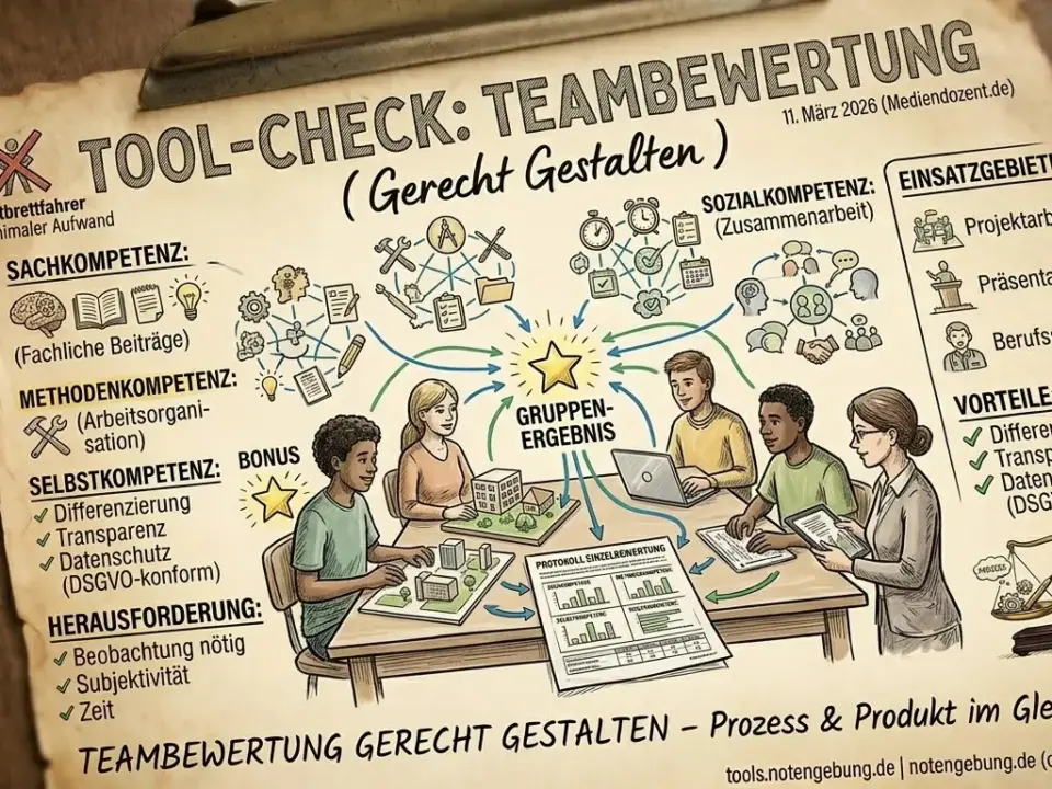 Teambewertung: Was das Tool kann – und warum es das tut Kategorie: Tools Lesezeit: ca. 7 Minuten Was kann das Tool? Die Teambewertung bewertet Gruppenarbeit kompetenzorientiert […]