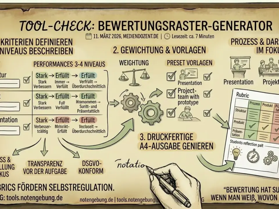 Bewertungsraster-Generator: Was das Tool kann – und warum es das tut Kategorie: Tools Lesezeit: ca. 7 Minuten Was kann das Tool? Der Bewertungsraster-Generator erstellt druckfertige Kompetenzraster […]