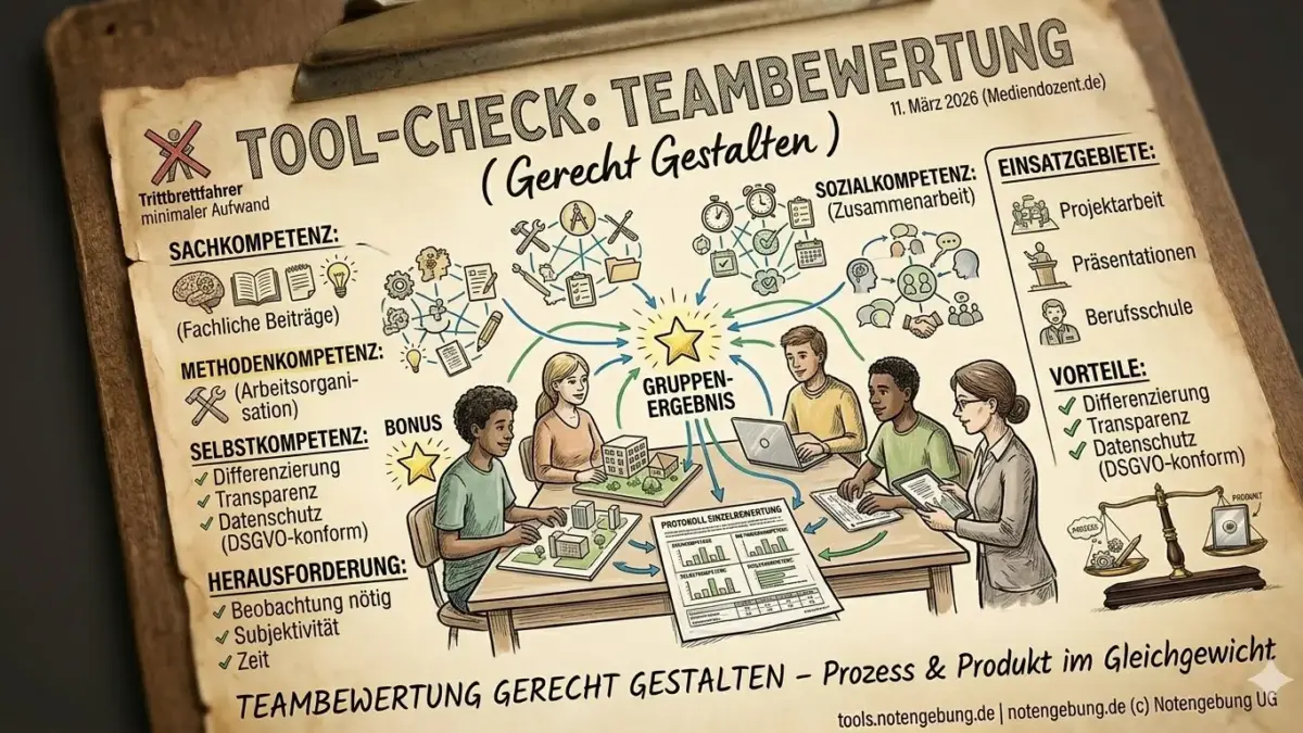 Gruppenarbeit ist didaktisch wertvoll – aber schwer zu benoten. Das Grundproblem: Eine Gruppenleistung sagt wenig darüber aus, was die einzelne Person beigetragen hat. Und eine reine Produktbewertung ignoriert den Prozess völlig. Das Tool macht beides sichtbar: individuelle Kompetenzeinschätzung und dokumentiertes Ergebnis. Es schafft die Grundlage für eine nachvollziehbare Bewertung, die über „alle bekommen die gleiche Note“ hinausgeht.