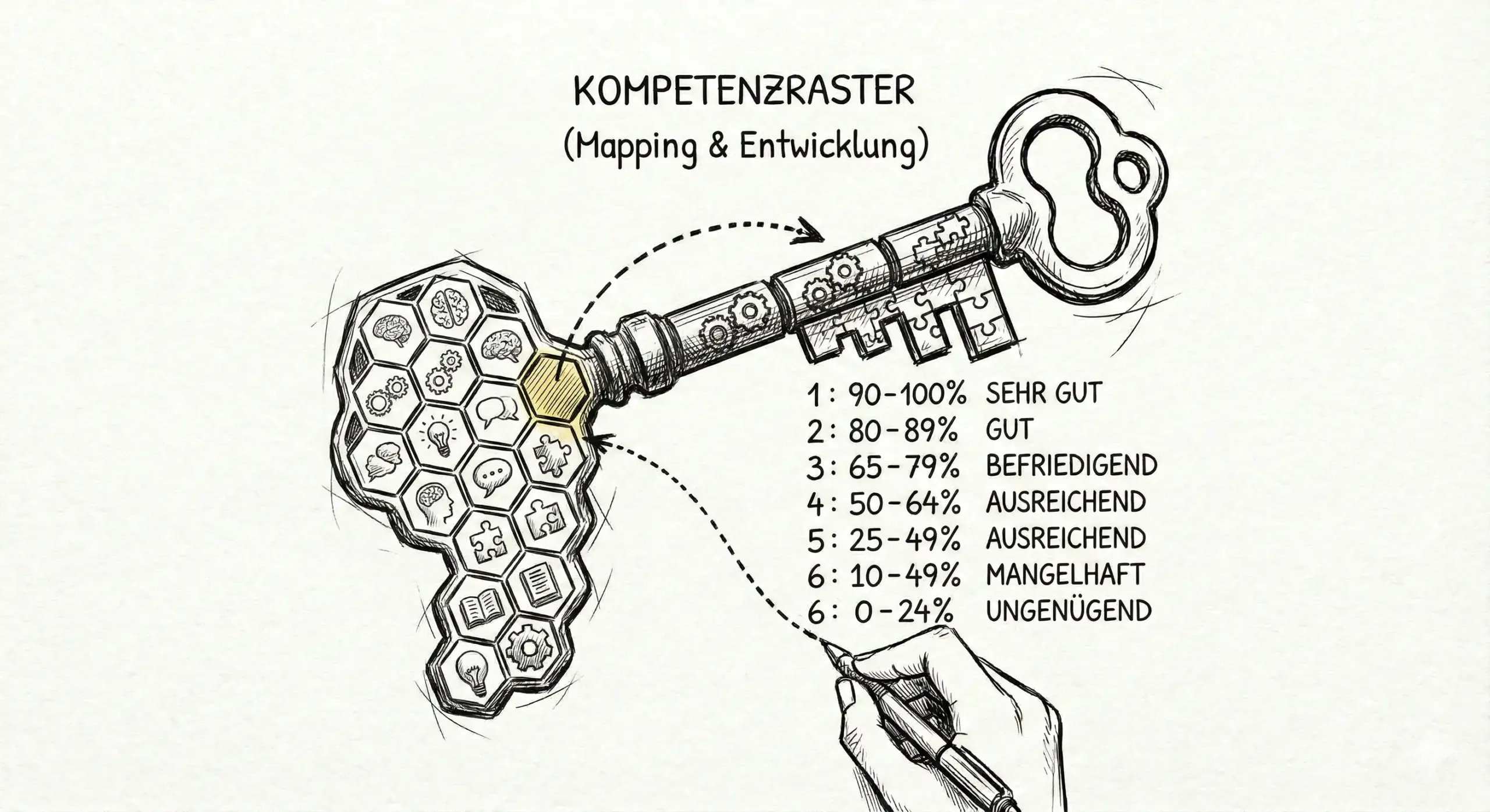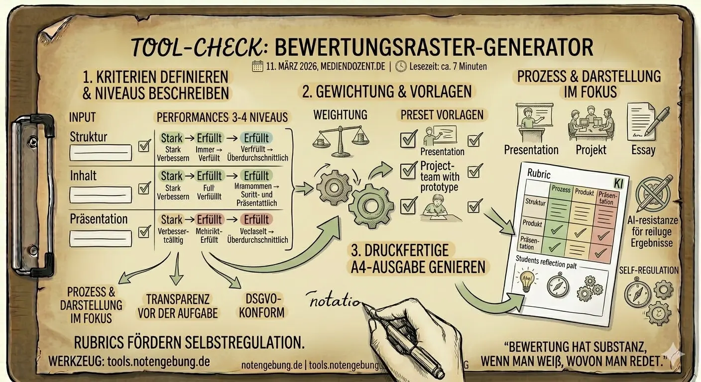 Kriterien definieren, Niveaus beschreiben, Gewichtung festlegen – druckfertiges Raster für Präsentationen, Projekte und Aufsätze.