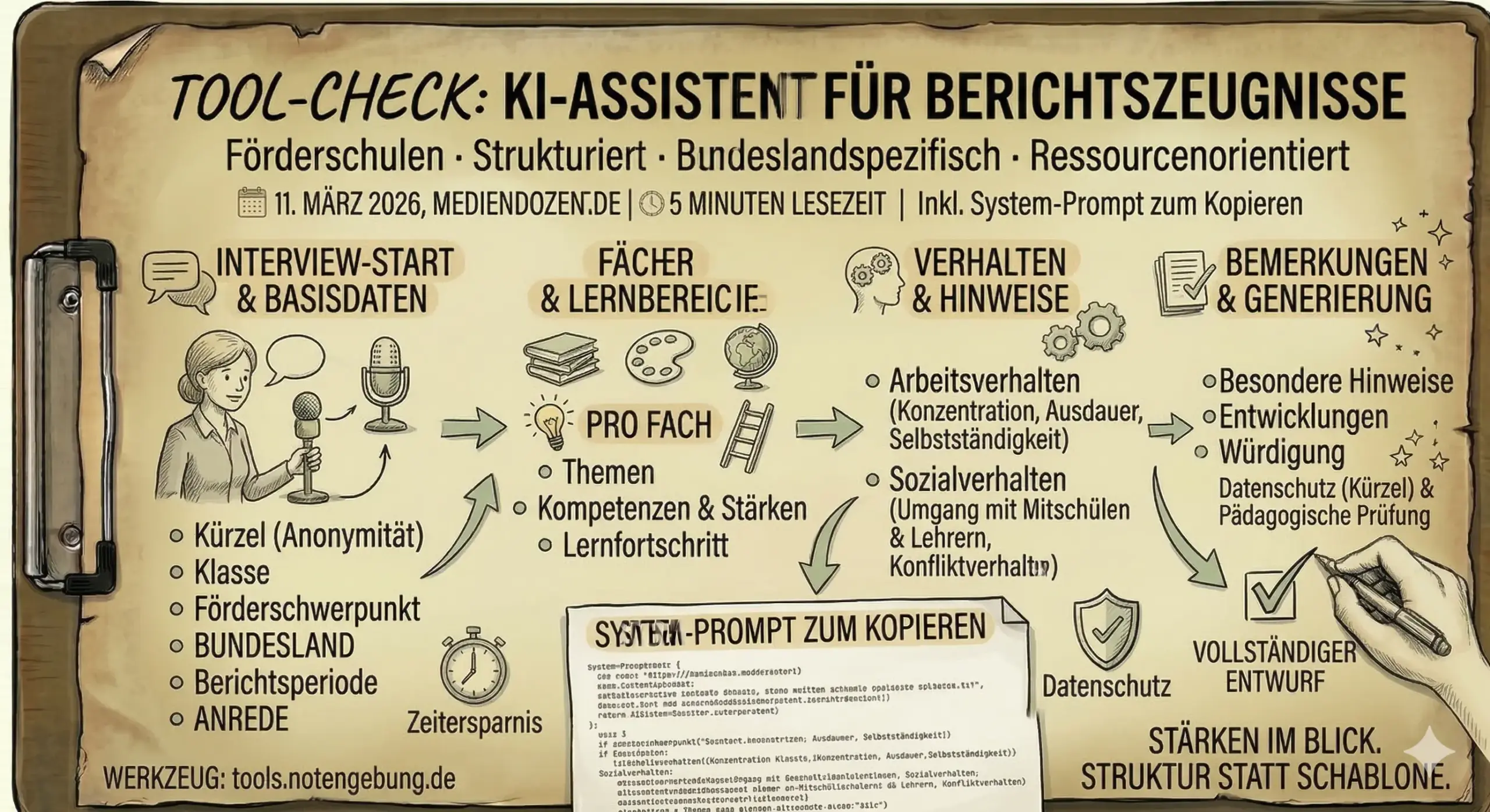 Fach für Fach, Bereich für Bereich – ein strukturiertes Interview für Förderschul-Berichtszeugnisse. Berücksichtigt Förderschwerpunkte Lernen, Geistige Entwicklung und ESE sowie bundeslandspezifische Vorgaben. Am Ende steht ein vollständiger, positiv formulierter Zeugnisentwurf.
