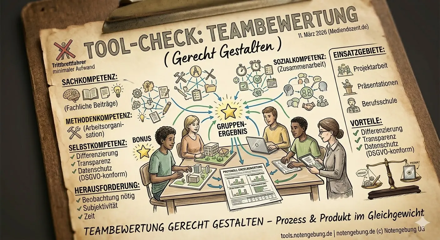 Kompetenzorientierte Bewertung für Gruppenprojekte. Vier Bereiche, individuell gewichtbar, Bonus-Option, Druckprotokoll.