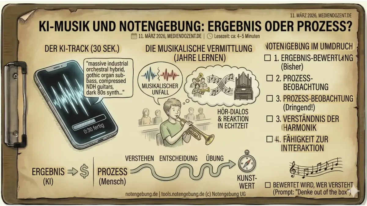 Drei Noten im Halbjahr – die müssen irgendwo herkommen. Und genau da wird es unbequem. Denn was man mit KI-Tools im Musikunterricht sinnvoll macht, lässt sich schlecht in eine Beurteilungsspalte pressen.